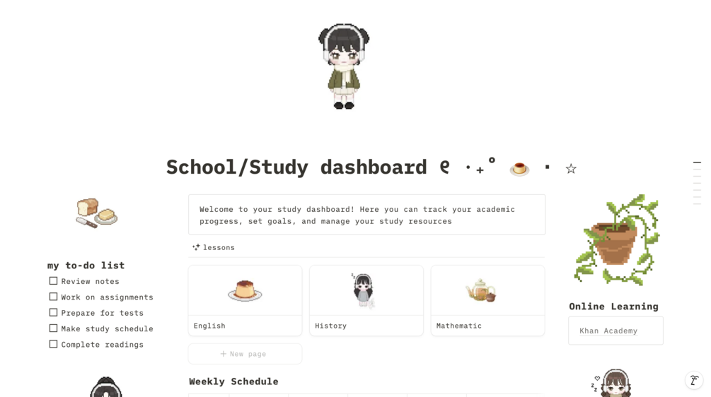 This template is designed specifically for students, offering a clean and minimalistic layout with a touch of pixel art aesthetics. It includes features like to-do lists, schedules, and a workspace area. Perfect for managing daily academic tasks, this template helps with organization, time management, and productivity. Customize it to fit your needs and optimize your workspace to achieve your academic goals effectively.